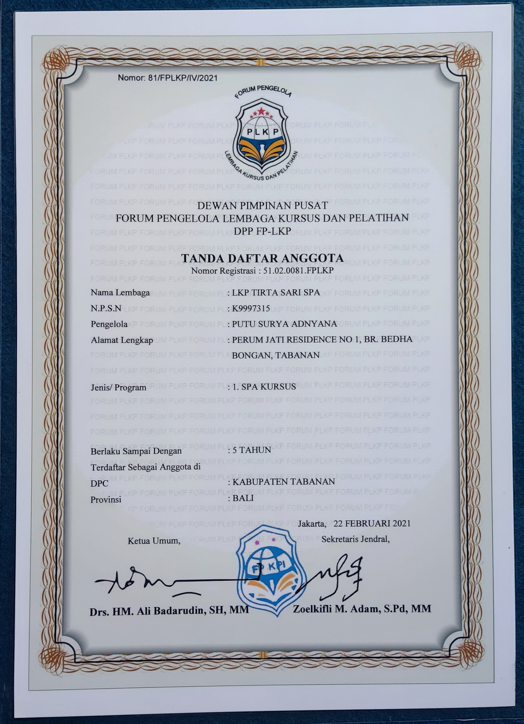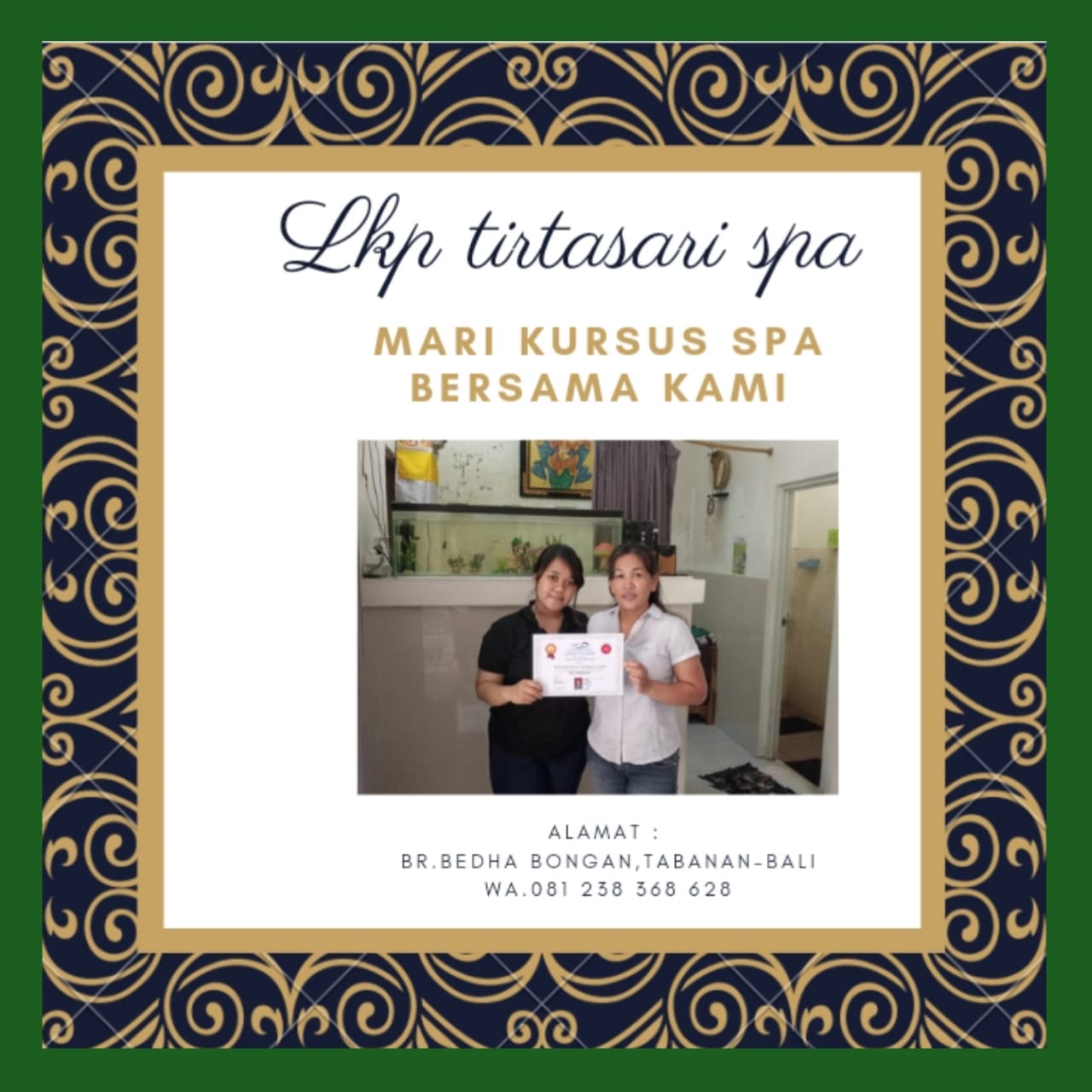 about LKP Tirtasari Spa My background is as a therapist working abroad to provide spa services from various groups with massage therapy, scrubs, facial washes, face polishes (masks), pedicures, manicures in famous five star hotels in Dubai and Turkey for many years, my conclusion is that from the various massages offered by hotels for foreign tourists in the form of thai massage, shiatsu massage, balinese massage etc. it turns out that balinese massage is the main choice for their massage. With this background experience, after I returned from working with a spa company abroad, my conscience moved me to open my own business in the form of a home spa which I started for several years with international standard services as my main menu, namely Balinese massage. For this reason, we developed the business we started with a legal entity in the form of a partnership company. To facilitate collaboration with various parties, our business was named CV.Tirtasari spa. our contat